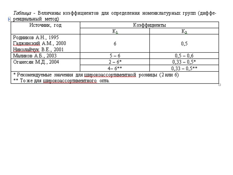 В общем случае граничные значения СА и СB для группирования рассчитываются с помощью коэффициентов Кi, величины которых приведены в таблице. Например, к группе А должны быть отнесены позиции номенклатуры, показатели которых а к группе В соответственно Аналогично для группы C