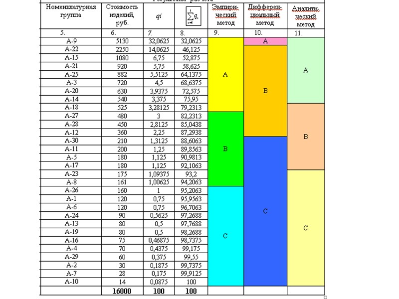 Ранжирование После расчета Сi все позиции номенклатуры располагаются в порядке убывания стоимостных показателей - ранжируются. Полученные значения показателей Ci ранжируются — располагаются в убывающей последовательности: Са ≥ С ь≥ ...≥ Сi ≥...≥ Ст. Затем производится присвоение новых индексов а = 1, b =2,..., т = N, где N— общее количество наименований деталей номенклатуры, т. е. C1 ≥ C2 ≥...Ci ≥... ≥ CN.