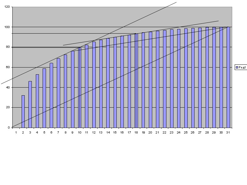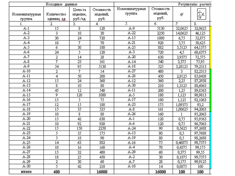Для удобства расчетов вводятся относительные величины рассматриваемых стоимостных показателей qi (в процентах), тем самым производим нормирование показателей: Величины qi суммируются нарастающим итогом:
