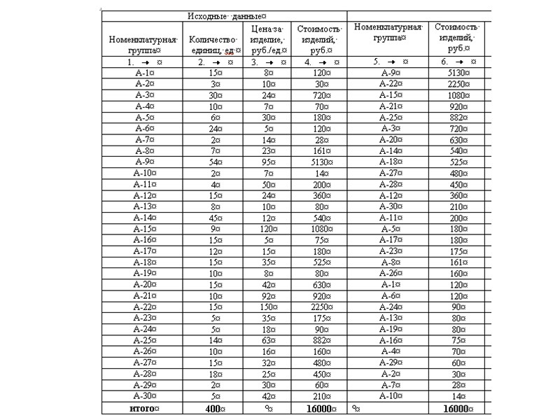 Выбор или расчет показателей для группировки. Для примера исходных данных, приведенного в таблице, могут быть выбраны следующие показателя для подразделения на группы: пi — количество единиц продукции, косвенно характеризующий оборот и выполнение соответствующих складских и транспортных операций; Цi — цена единицы продукции Ci — стоимость продукции. Допустим, что на группы разбивается стоимостной показатель: Сi = ni *Цi