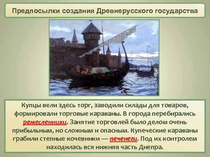 Предпосылки создания Древнерусского государства Купцы вели здесь торг, заводили склады для товаров, формировали торговые караваны. В города перебирались ремесленники. Занятие торговлей было делом очень ремесленники прибыльным, но сложным и опасным. Купеческие караваны грабили степные кочевники — печенеги. Под их контролем печенеги находилась вся нижняя часть Днепра.