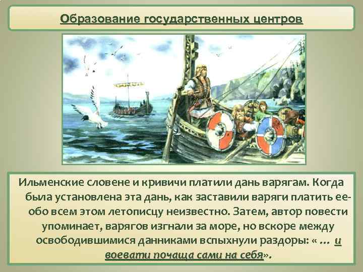 Образование государственных центров Ильменские словене и кривичи платили дань варягам. Когда была установлена эта дань, как заставили варяги платить ееобо всем этом летописцу неизвестно. Затем, автор повести упоминает, варягов изгнали за море, но вскоре между освободившимися данниками вспыхнули раздоры: « … и воевати почаща сами на себя» . себя