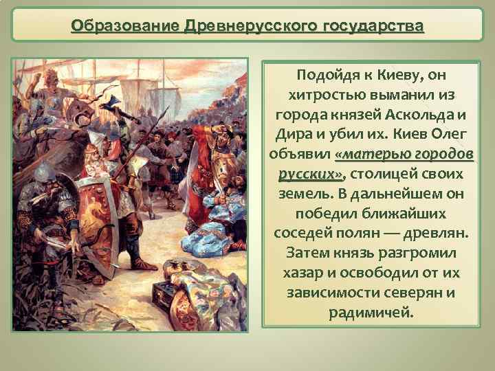 Образование Древнерусского государства Подойдя к Киеву, он хитростью выманил из города князей Аскольда и Дира и убил их. Киев Олег объявил «матерью городов русских» , столицей своих русских» земель. В дальнейшем он победил ближайших соседей полян — древлян. Затем князь разгромил хазар и освободил от их зависимости северян и радимичей.