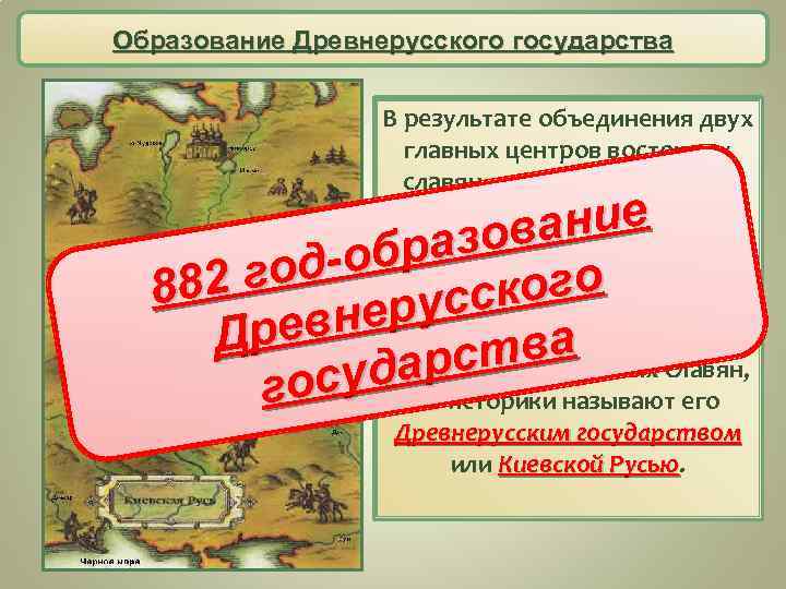 Образование Древнерусского государства В результате объединения двух главных центров восточных славян — южного во главе с Киевом и северного во главе с Новгородом — образовалось государство, получившее название Русь. Поскольку это Русь было первое, самое древнее государство восточных славян, то историки называют его Древнерусским государством или Киевской Русью ание азов -обр 2 год 88 кого русс евне Др тва дарс госу