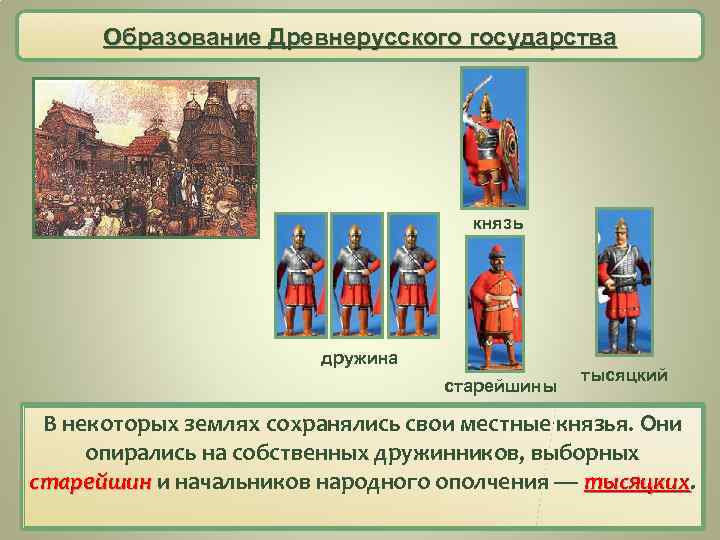 Образование Древнерусского государства князь дружина старейшины тысяцкий В некоторых центрахсохранялись свои местные князья. Они В городских землях все важнейшие вопросы решало вече. Оно собиралось по звону вечевого колокола. Решения опирались на собственных дружинников, выборных старейшин и начальников народного ополчения — тысяцких. принимались громкими криками согласия или несогласия — тысяцких большинством голосов.