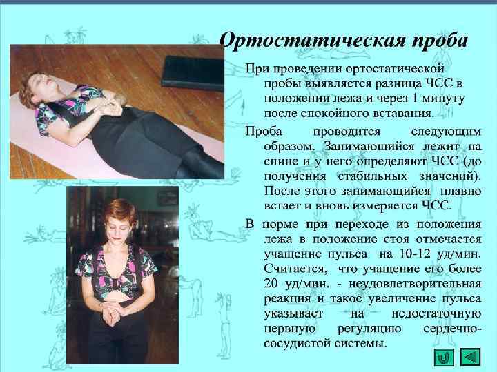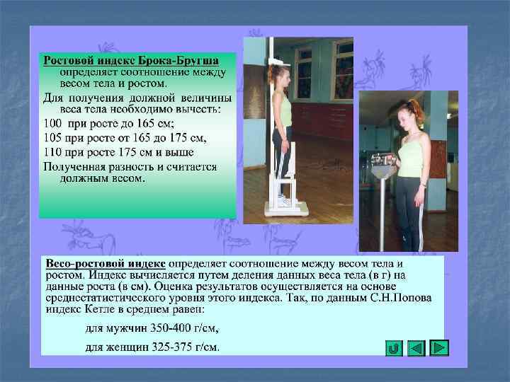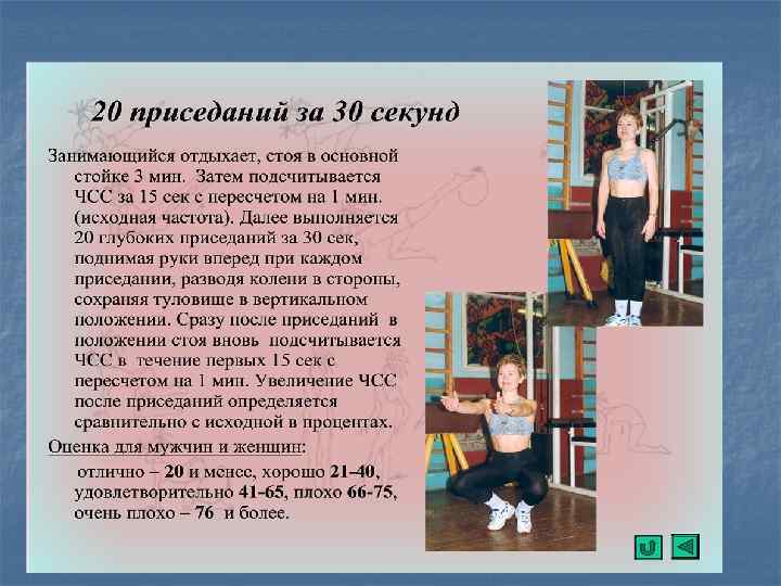 РАСЧЕТ БИОЛОГИЧЕСКОГО ВОЗРАСТА Мужчины БВ=27, 0+0, 22 х. АДС – 0, 15 ХЗДВ-0, 72 х. СОЗ – 0, 15 х. СБ Женщины БВ=- 1, 46+0, 42 х. АДП+0, 25 х. МТ+0, 70 х. СОЗ 0, 14 х. СБ где: АДС - систолическое давление АДП - пульсовое давление, т. е. разница между АДС и АДП МТ-масса тела в кг. СОЗ - индекс субъективной оценки здоровья по анкете ЗДВ - продолжительность задержки дыхания после глубокого вдоха в сек. СБ - статистическая балансировка, определяется при стоянии испытуемого на левой ноге, без обуви, глаза закрыты, руки опущены вдоль туловища, без предварительной подготовки. Учитывается лучший вариант из трех попыток, с интервалом 5 минут. КВ - календарный возраст в годах