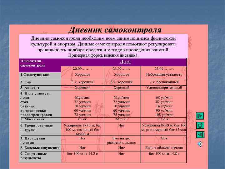 Определите содержание средств: n Физические упражнения, n Дыхательные упражнения, n Формулы аутотренинга и т. п. n Прогулки, терренкур. n Сон, диета, вид закаливания и т. п. n Ведение дневника самоконтроля, n Напоминания различного типа и т. д.