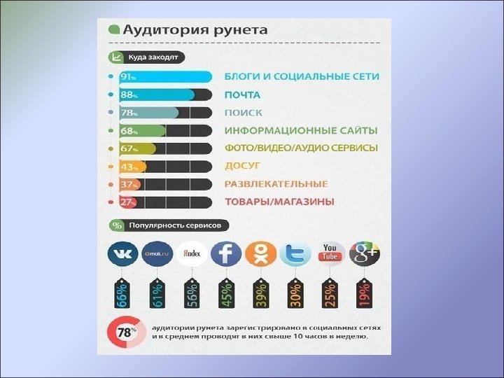 Как сделать выбор? Как много ваших пользователей пользуются интернетом и социальными сетями • Проанализируйте категории пользователей • Проведите изучение и анализ данных присутствия ваших пользователей в социальных сетях. • Выберете 3 -5 соцмедиа для активной работы, включив в список где уже присутсвуют ваши пользователи и где они могут появиться (самые популярные соцсети) Если вы по прошествии времени обнаружили, что активность работы в определенной сети резко уменьшилась или не приносит результата попытайтесь предпринять меры по активизации, и при отрицательной реакции после этого вычеркните ее из своей работы (а лучше «заглушите работу» ) и активно работайте в другом направлении.