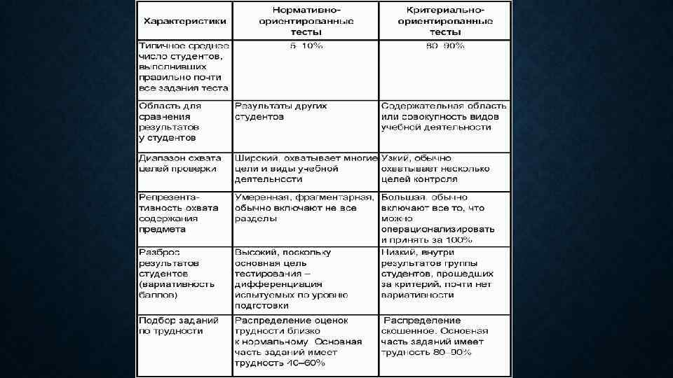 ДВА ОСНОВНЫХ ВИДА КРИТЕРИАЛЬНО - ОРИЕНТИРОВАННЫХ ТЕСТОВ domain-referenced test mastery test оценка доли от полного объема учебного материала, которую усвоил испытуемый определение в группе испытуемых квалифицированных и неквалифицированных (masters and nomasters) в какой-то области • Предполагается, что в результате обучения учащиеся должны приобрести определенную сумму знаний, умений и навыков, которая является областью содержания теста и условно принимается за 100 процентов. • Эмпирическая процедура анализа тестовых заданий в данном случае рекомендована для того, чтобы определить «чувствительность» тестовых заданий к различию между обученными и необученными испытуемыми. • Для итогового контроля наиболее естественно применять именно этот тип тестов.