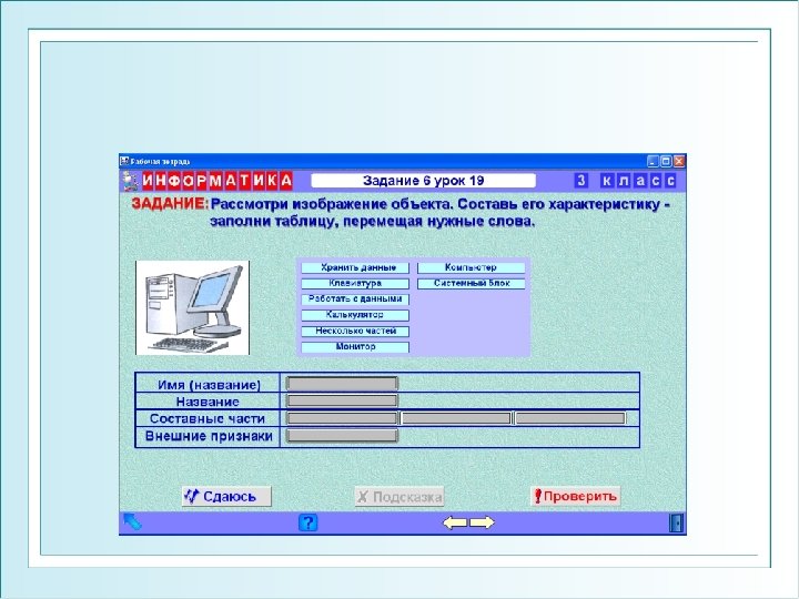 Тематический блок «Объект и его свойства» Формируемые понятия: Объект, свойства объекта, свойства целого и свойства частей, общие свойства, отличительные свойства, существенные свойства, виды объектов, отношения между объектами (пространственные, временные, причинно следственные, противоположности и другие), характеристика объекта; Логические объекты (понятие, суждение, умозаключение).
