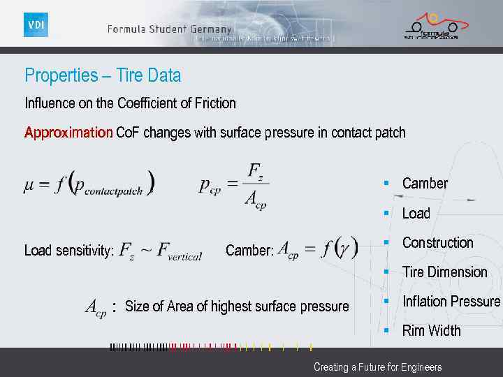 Properties – Tire Data Influence on the Coefficient of Friction Approximation Co. F changes with surface pressure in contact patch : § Camber § Load sensitivity: § Construction Camber: § Tire Dimension Size of Area of highest surface pressure § Inflation Pressure § Rim Width Creating a Future for Engineers