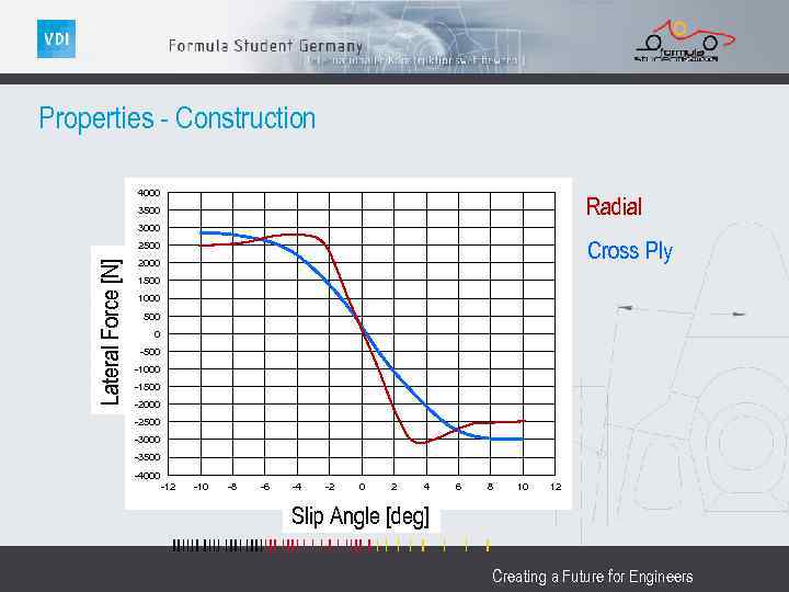 Properties - Construction 4000 Radial 3500 3000 Cross Ply Lateral Force [N] 2500 2000 1500 1000 500 0 -500 -1000 -1500 -2000 -2500 -3000 -3500 -4000 -12 -10 -8 -6 -4 -2 0 2 4 6 8 10 12 Slip Angle [deg] Creating a Future for Engineers