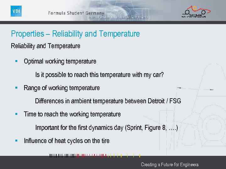 Properties – Reliability and Temperature § Optimal working temperature Is it possible to reach this temperature with my car? § Range of working temperature Differences in ambient temperature between Detroit / FSG § Time to reach the working temperature Important for the first dynamics day (Sprint, Figure 8, …. ) § Influence of heat cycles on the tire Creating a Future for Engineers
