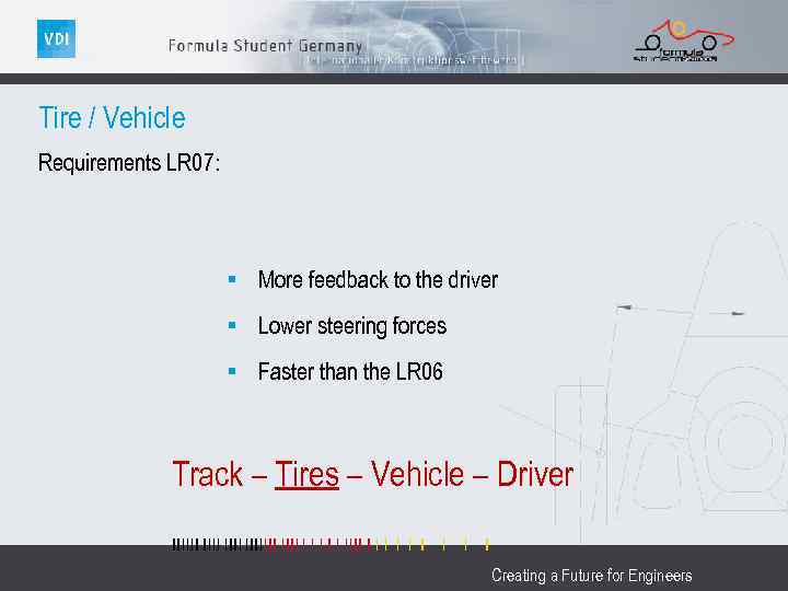 Tire / Vehicle Requirements LR 07: § More feedback to the driver § Lower steering forces § Faster than the LR 06 Track – Tires – Vehicle – Driver Creating a Future for Engineers