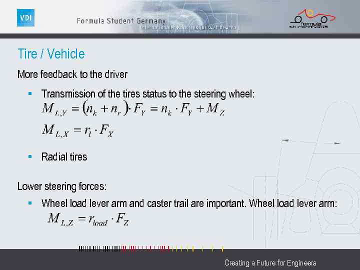 Tire / Vehicle More feedback to the driver § Transmission of the tires status to the steering wheel: § Radial tires Lower steering forces: § Wheel load lever arm and caster trail are important. Wheel load lever arm: Creating a Future for Engineers