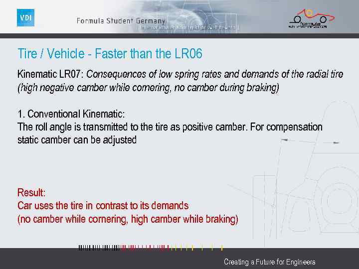 Tire / Vehicle - Faster than the LR 06 Kinematic LR 07: Consequences of low spring rates and demands of the radial tire (high negative camber while cornering, no camber during braking) 1. Conventional Kinematic: The roll angle is transmitted to the tire as positive camber. For compensation static camber can be adjusted Result: Car uses the tire in contrast to its demands (no camber while cornering, high camber while braking) Creating a Future for Engineers