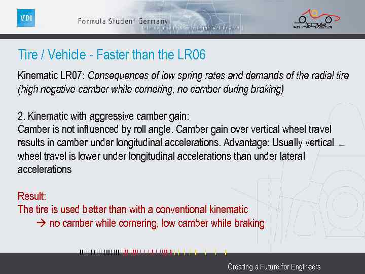 Tire / Vehicle - Faster than the LR 06 Kinematic LR 07: Consequences of low spring rates and demands of the radial tire (high negative camber while cornering, no camber during braking) 2. Kinematic with aggressive camber gain: Camber is not influenced by roll angle. Camber gain over vertical wheel travel results in camber under longitudinal accelerations. Advantage: Usually vertical wheel travel is lower under longitudinal accelerations than under lateral accelerations Result: The tire is used better than with a conventional kinematic no camber while cornering, low camber while braking Creating a Future for Engineers
