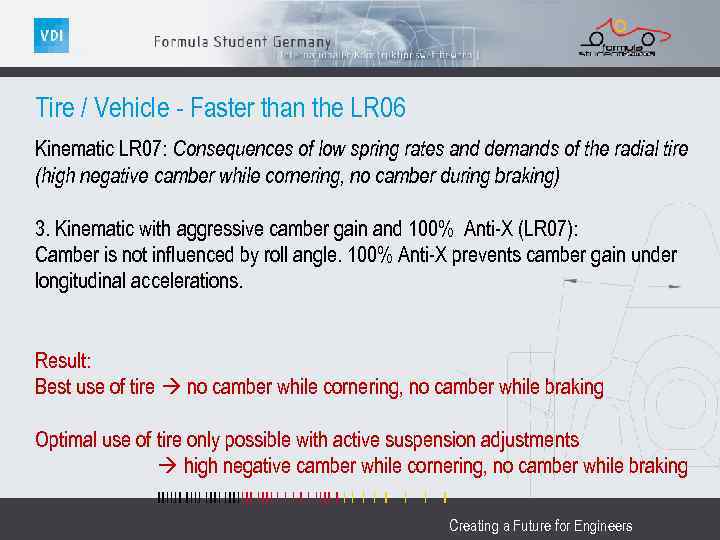 Tire / Vehicle - Faster than the LR 06 Kinematic LR 07: Consequences of low spring rates and demands of the radial tire (high negative camber while cornering, no camber during braking) 3. Kinematic with aggressive camber gain and 100% Anti-X (LR 07): Camber is not influenced by roll angle. 100% Anti-X prevents camber gain under longitudinal accelerations. Result: Best use of tire no camber while cornering, no camber while braking Optimal use of tire only possible with active suspension adjustments high negative camber while cornering, no camber while braking Creating a Future for Engineers