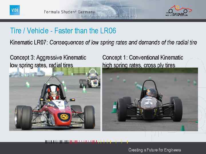 Tire / Vehicle - Faster than the LR 06 Kinematic LR 07: Consequences of low spring rates and demands of the radial tire Concept 3: Aggressive Kinematic low spring rates, radial tires Concept 1: Conventional Kinematic high spring rates, cross ply tires Creating a Future for Engineers