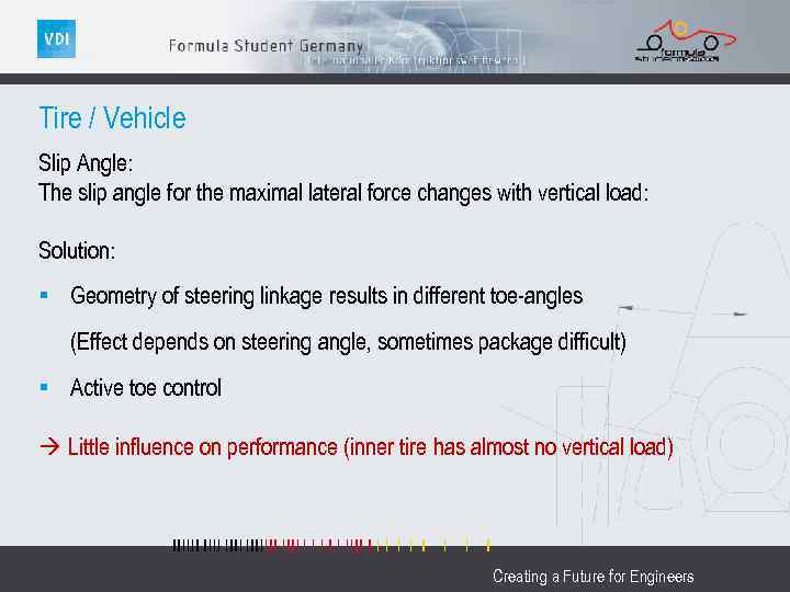 Tire / Vehicle Slip Angle: The slip angle for the maximal lateral force changes with vertical load: Solution: § Geometry of steering linkage results in different toe-angles (Effect depends on steering angle, sometimes package difficult) § Active toe control Little influence on performance (inner tire has almost no vertical load) Creating a Future for Engineers