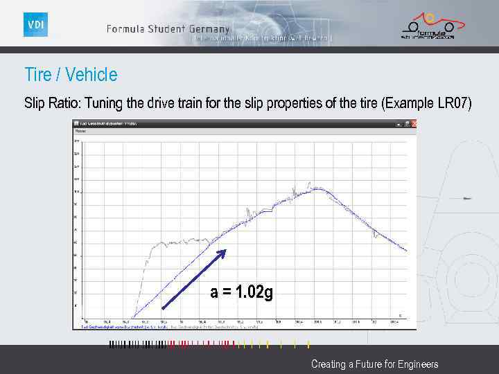 Tire / Vehicle Slip Ratio: Tuning the drive train for the slip properties of the tire (Example LR 07) a = 1. 02 g Creating a Future for Engineers