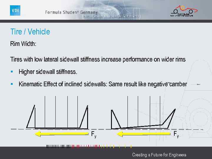 Tire / Vehicle Rim Width: Tires with low lateral sidewall stiffness increase performance on wider rims § Higher sidewall stiffness. § Kinematic Effect of inclined sidewalls: Same result like negative camber Fy Fy Creating a Future for Engineers