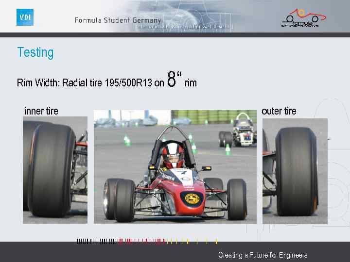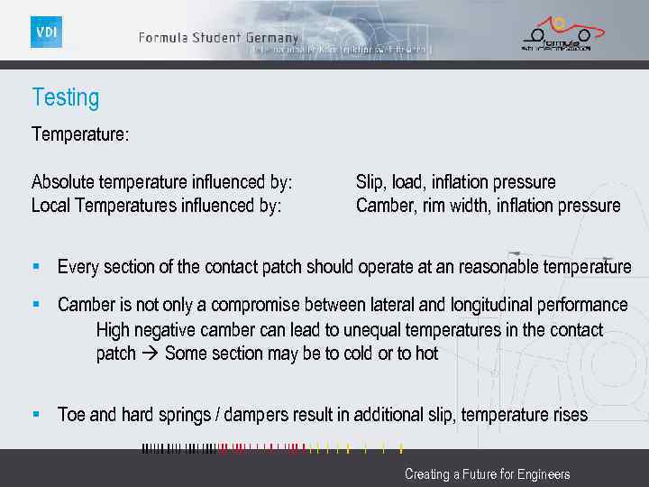 Testing Temperature: Absolute temperature influenced by: Local Temperatures influenced by: Slip, load, inflation pressure Camber, rim width, inflation pressure § Every section of the contact patch should operate at an reasonable temperature § Camber is not only a compromise between lateral and longitudinal performance High negative camber can lead to unequal temperatures in the contact patch Some section may be to cold or to hot § Toe and hard springs / dampers result in additional slip, temperature rises Creating a Future for Engineers