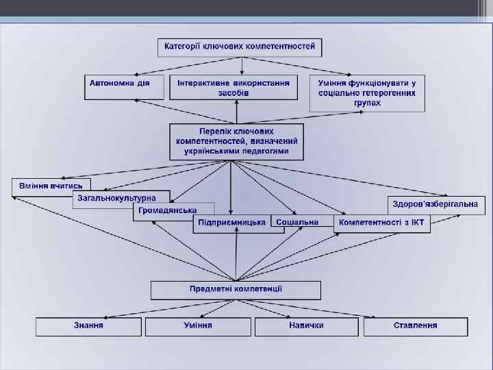 Ключові компетентності (визначені Радою Європи) • Політичні та соціальні компетентності • Компетентності, пов'язані з життям у мультикультурному суспільстві • Компетентності, які стосуються володіння усним та письмовим спілкуванням • Компетентності, пов'язані з розвитком інформаційного суспільства • Щодо готовності й здатності вчитися протягом усього життя (Міжнародне дослідження “Визначення та відбір компетентностей” 1997 -2003 рр. )