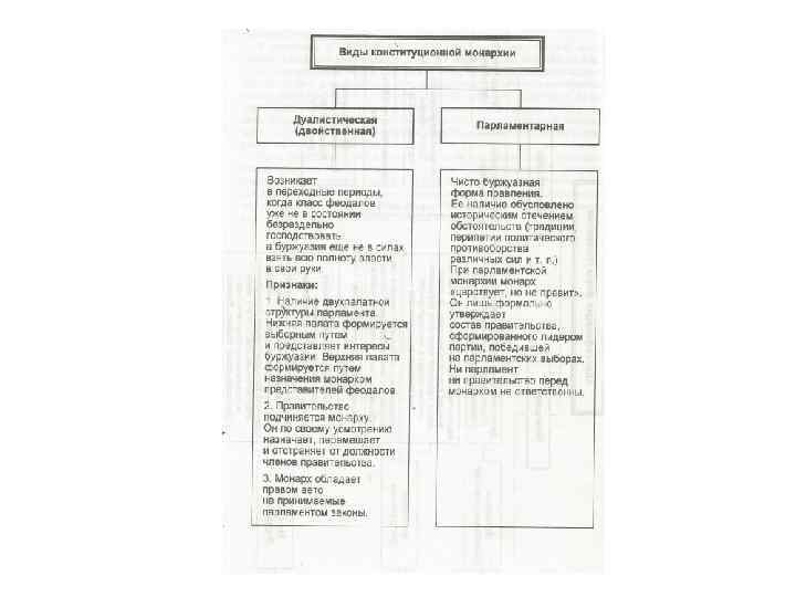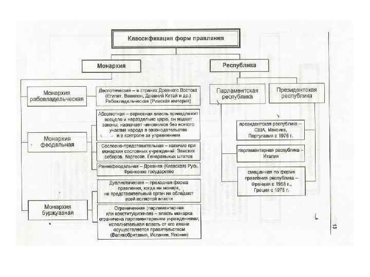 Форма государства - понятие и структура Форма государства - это способ организации и реализации государственной власти. В состав формы государства входят: 1) форма государственного правления, 2) форма государственного устройства, 3) форма государственного (политического) режима. Форма государственного правления - это способ организации высшей государственной власти, проявляющийся в определенной структуре ее органов, порядке их образования, характере их взаимоотношения между собой (распределение между ними компетенции) и с населением (степень участия населения в их формировании) По форме государственного правления государства подразделяются на монархии и республики В монархии высшая государственная власть, обычно передаваемая по наследству, осуществляется полностью (абсолютная монархия) или частично (ограниченная монархия) одним лицом. В ограниченной ( «конституционной» ) монархии власть монарха ограничена парламентом. Это ограничение закреплено утверждаемой парламентом конституцией, которую монарх не в праве изменить.