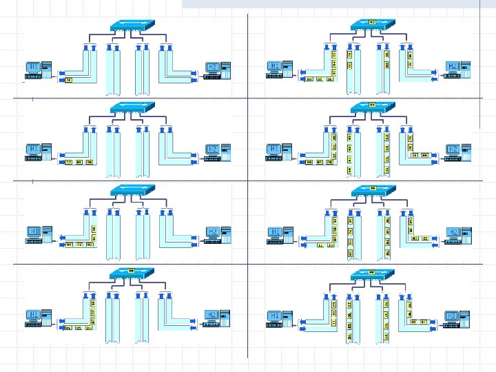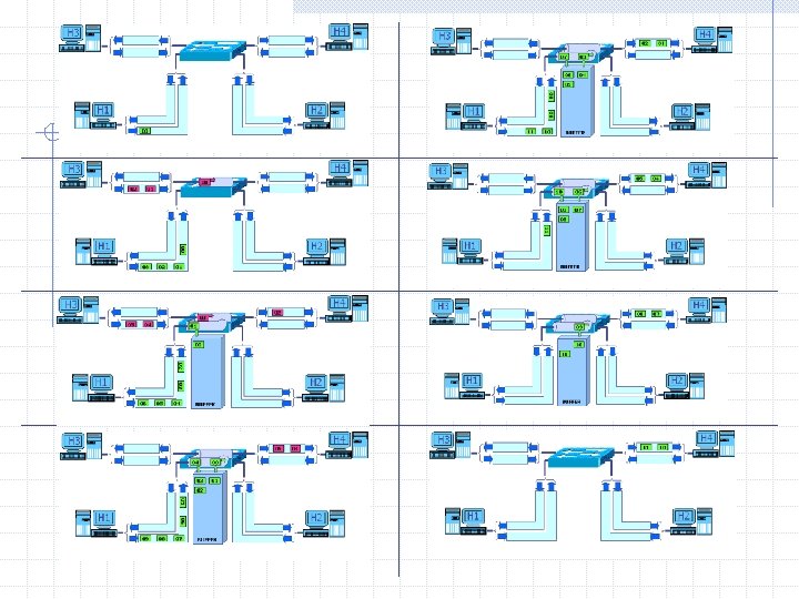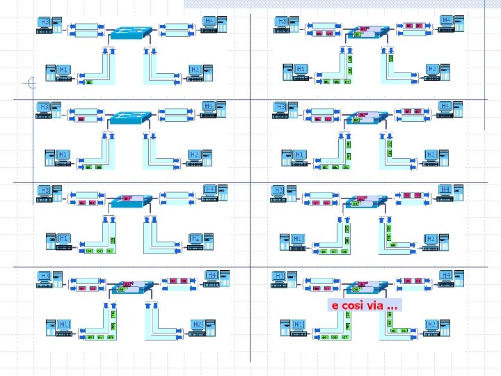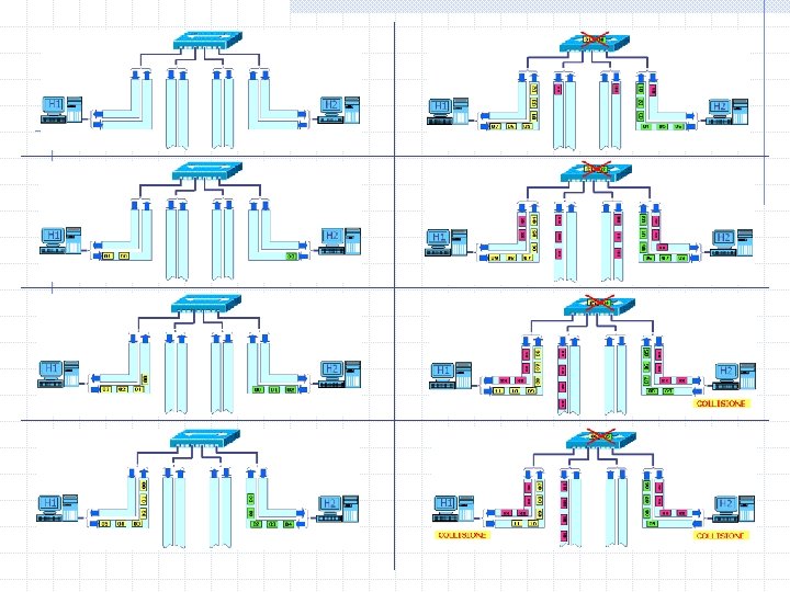 Collisioni su cavo UTP TRASFERIMENTO CON COLLISIONE IN UNO SWITCH se con dispositivi half-duplex da H 1 a H 4 e contemporaneamente da H 4 a H 3