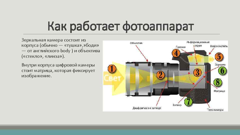 Как работает фотоаппарат Зеркальная камера состоит из корпуса (обычно — «тушка» , » боди» — от английского body ) и объектива ( «стекло» , «линза» ). Внутри корпуса цифровой камеры стоит матрица, которая фиксирует изображение.