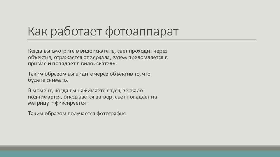 Как работает фотоаппарат Когда вы смотрите в видоискатель, свет проходит через объектив, отражается от зеркала, затем преломляется в призме и попадает в видоискатель. Таким образом вы видите через объектив то, что будете снимать. В момент, когда вы нажимаете спуск, зеркало поднимается, открывается затвор, свет попадает на матрицу и фиксируется. Таким образом получается фотография.