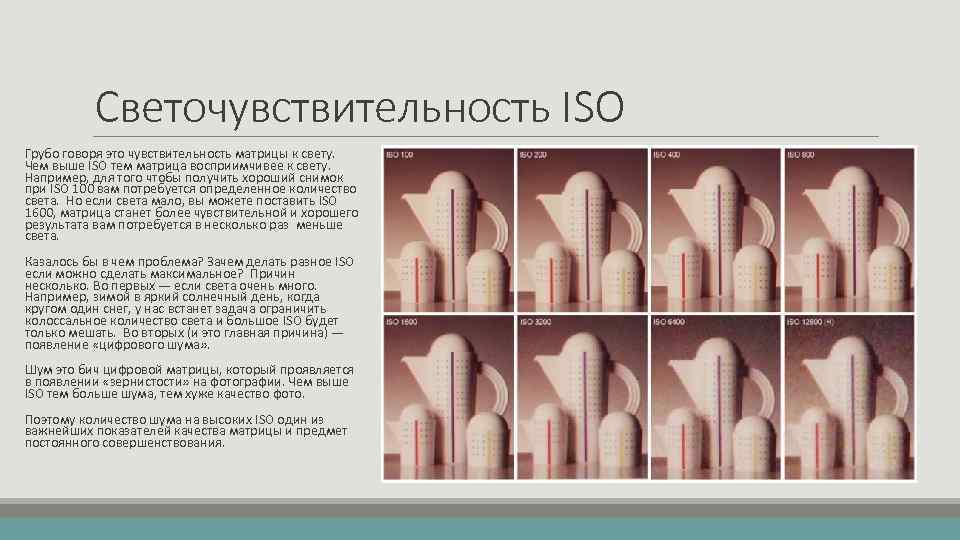 Светочувствительность ISO Грубо говоря это чувствительность матрицы к свету. Чем выше ISO тем матрица восприимчивее к свету. Например, для того чтобы получить хороший снимок при ISO 100 вам потребуется определенное количество света. Но если света мало, вы можете поставить ISO 1600, матрица станет более чувствительной и хорошего результата вам потребуется в несколько раз меньше света. Казалось бы в чем проблема? Зачем делать разное ISO если можно сделать максимальное? Причин несколько. Во первых — если света очень много. Например, зимой в яркий солнечный день, когда кругом один снег, у нас встанет задача ограничить колоссальное количество света и большое ISO будет только мешать. Во вторых (и это главная причина) — появление «цифрового шума» . Шум это бич цифровой матрицы, который проявляется в появлении «зернистости» на фотографии. Чем выше ISO тем больше шума, тем хуже качество фото. Поэтому количество шума на высоких ISO один из важнейших показателей качества матрицы и предмет постоянного совершенствования.