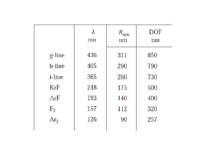 Аналогия между разрешением ОС и оптической ПФЛ является неполной, т. к. предел разрешения для любой оптической проекционной системы ФЛ определяется в способности разрешить произвольные малые или близко расположенные элементы (features) в проявленной ФР маске. Следовательно, разрешение систем оптической ПФЛ зависит еще от коэффициента отражения функциональных слоев под ФР, от плоскостности пластины и величины топологического рельефа на ней, от глубины фокуса, от чувствительности и контраста используемого ФР, степени пространственной когерентности экспонирующего излучения и др. Поэтому выражение для разрешения системы оптической ПФЛ обычно записывается в виде: R = Lmin = k 1∙λ/NA, где k 1 - характеристический постоянный коэффициент, отражающий специфику всего конкретного фотолитографического процесса.