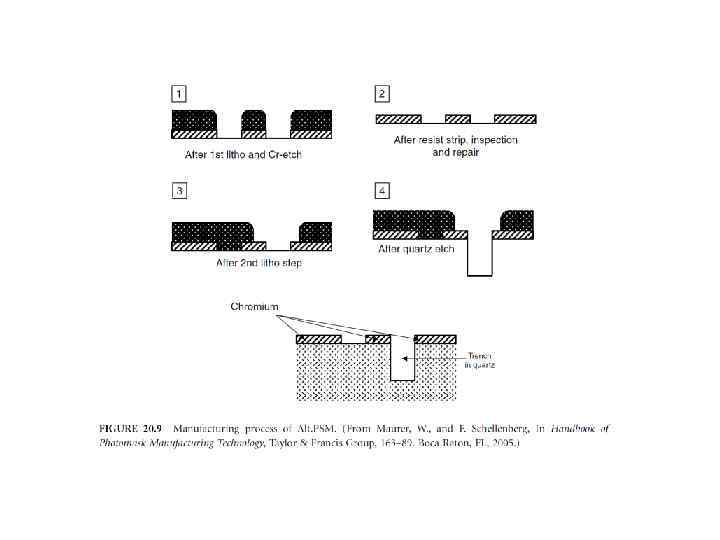 Поскольку все фазосдвигающие границы формируют узкие темные линии на фоторезисте, только замкнутые области могут обрабатываться с помощью фазосдвигающего фотошаблона. Обычно требуются две экспозиции: вторая экспозиция дополняет первую Схематическое изображение фотолитографического процесса с двойной экспозицией. Фазосдвигающий фотошаблон (слева) и корректирующий фотошаблон (в середине) последовательно экспонируются на одну и ту же область кристалла. Окончательный рисунок на кристалле (справа) является результатом этих двух экспозиций.