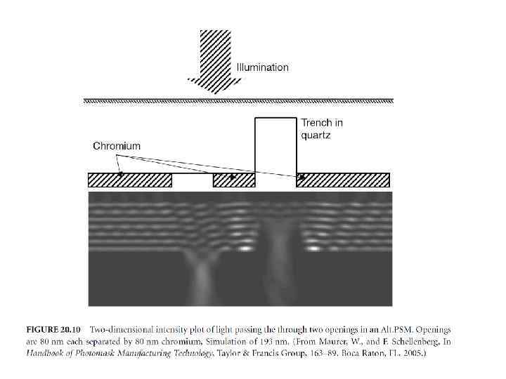 Схематическое изображение безхромного PSM (слева) и тонкие линии, которые он формирует на поверхности фоторезиста (справа).