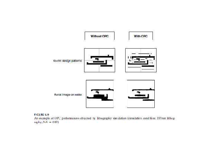 3. Проведение коррекции эффектов оптической близости (optical proximity correction - OPC) элементов топологического рисунка на фотошаблоне (ФШ) путем добавления к этим элементам дополнительных служебных элементов, повышающих точность передачи рисунка на фоторезистивную маску (ФРМ) Воспроизведение требуемой топологии элемента в проявленной фоторезистивной маске (ФРМ) на пластине с помощью обычного фотошаблона (ФШ) (верхний ряд) и с помощью фотошаблона с геометрической коррекцией эффектов оптической близости элемента