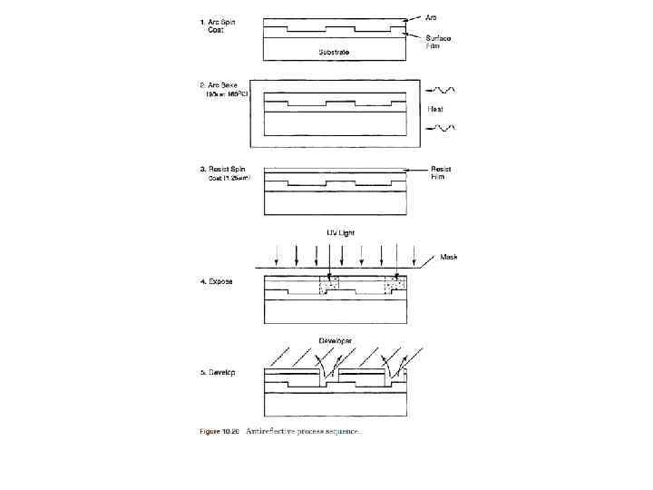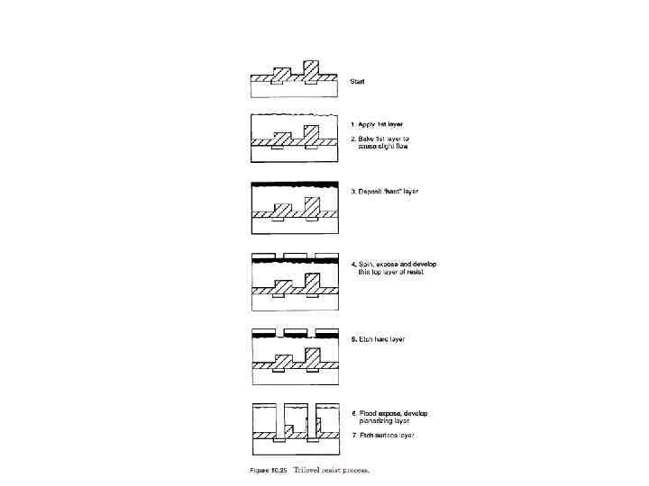 Схемы литографического процесса с двойным резистом разной полярности. На первом этапе на подложку с ранее организованным сложным рельефом наносится толстый слой положительного резита. Его толщина выбирается из условия достижения максимальной планаризации поверхности пластины. Затем наносится тонкий слой резиста другой полярности. Его толщина выбирается из условия получения оптимальной глубины фокуса и достижения наивысшего разрешения для данной оптической системы. После экспонирования и проявления тонкого верхнего резистивного слоя он играет роль маски при глубоком экспонировании толстого нижележащего резиста.