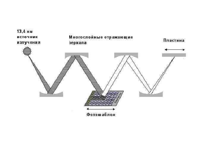 ЭУФ-литография NA=0, 25 – 0, 40; k 1=0, 6 – 0, 4; R = 32 – 12 нм • Преимущества: - ЭУФЛ является оптической и проекционной, используются стеклянные заготовки для шаблонов; - может быть использована для нескольких поколений ИС; - работоспособность уже продемонстрирована на прототипах литографов, - возможность создать источник света с меньшей длиной волны. Все отражательные оптические системы должны быть асферическими с размером неоднородностей ~10 Å. Эти зеркала представляют собой сложные пленочные покрытия: от 40 до 80 двухслойных пленок с толщиной каждого слоя ~ /4. Такое же сложное строение имеет маска для EUV литографии,