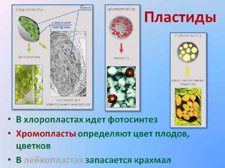 Пластиды Лейкопласты Хлоропласты Хромопласты Строение 2 мембраны Наружная Внутренняя (содержащие хлорофилл граны, собранные из стопки тилакоидных мембран) Матрикс (внутренняя полужидкая среда, содержащая белки, ДНК, РНК и рибосомы) Функции: • Синтез АТФ • Синтез углеводов • Биосинтез собственных белков Вернуться