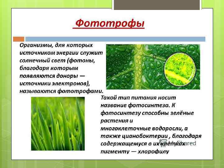 Фототрофты – барлық жасыл өсімдіктер және прокариот патшалығының жеке өкілдері жататын автотрофтар