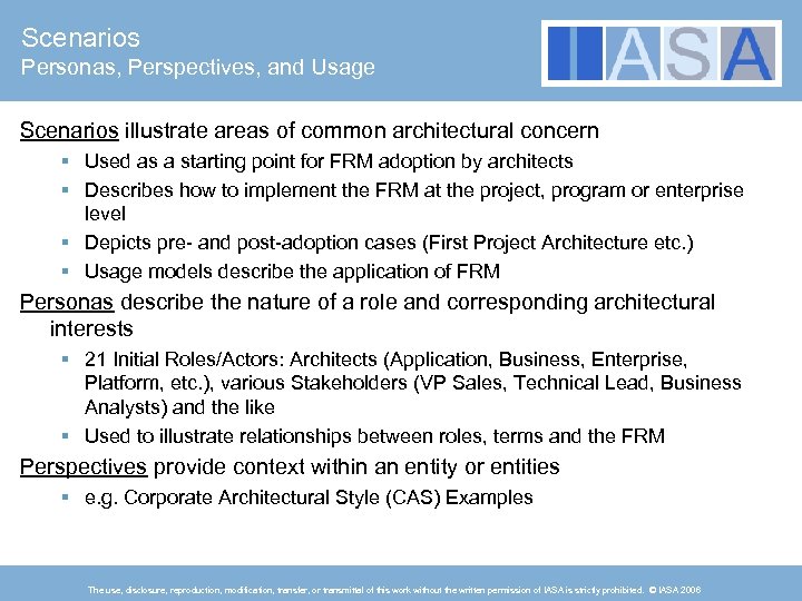 Scenarios Personas, Perspectives, and Usage Scenarios illustrate areas of common architectural concern § Used as a starting point for FRM adoption by architects § Describes how to implement the FRM at the project, program or enterprise level § Depicts pre- and post-adoption cases (First Project Architecture etc. ) § Usage models describe the application of FRM Personas describe the nature of a role and corresponding architectural interests § 21 Initial Roles/Actors: Architects (Application, Business, Enterprise, Platform, etc. ), various Stakeholders (VP Sales, Technical Lead, Business Analysts) and the like § Used to illustrate relationships between roles, terms and the FRM Perspectives provide context within an entity or entities § e. g. Corporate Architectural Style (CAS) Examples The use, disclosure, reproduction, modification, transfer, or transmittal of this work without the written permission of IASA is strictly prohibited. © IASA 2006