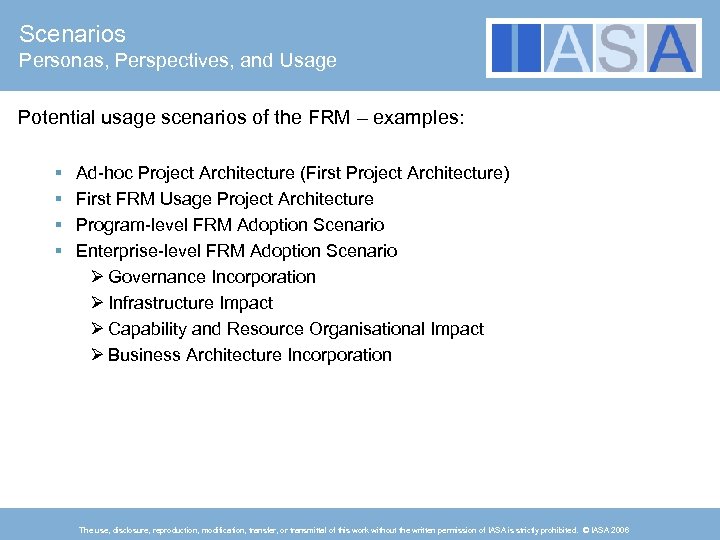 Scenarios Personas, Perspectives, and Usage Potential usage scenarios of the FRM – examples: § § Ad-hoc Project Architecture (First Project Architecture) First FRM Usage Project Architecture Program-level FRM Adoption Scenario Enterprise-level FRM Adoption Scenario Ø Governance Incorporation Ø Infrastructure Impact Ø Capability and Resource Organisational Impact Ø Business Architecture Incorporation The use, disclosure, reproduction, modification, transfer, or transmittal of this work without the written permission of IASA is strictly prohibited. © IASA 2006