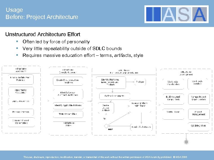 Usage Before: Project Architecture Unstructured Architecture Effort § Often led by force of personality § Very little repeatability outside of SDLC bounds § Requires massive education effort – terms, artifacts, style The use, disclosure, reproduction, modification, transfer, or transmittal of this work without the written permission of IASA is strictly prohibited. © IASA 2006