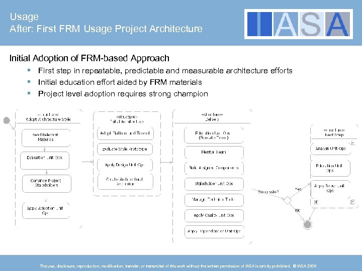 Usage After: First FRM Usage Project Architecture Initial Adoption of FRM-based Approach § First step in repeatable, predictable and measurable architecture efforts § Initial education effort aided by FRM materials § Project level adoption requires strong champion The use, disclosure, reproduction, modification, transfer, or transmittal of this work without the written permission of IASA is strictly prohibited. © IASA 2006