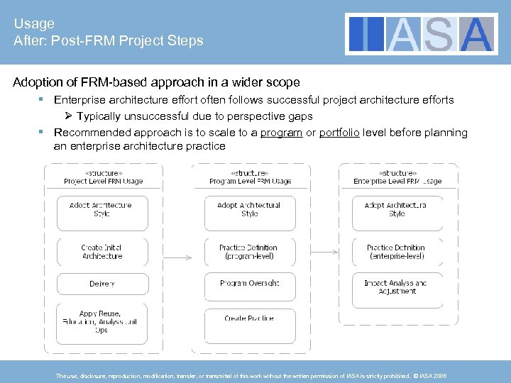 Usage After: Post-FRM Project Steps Adoption of FRM-based approach in a wider scope § Enterprise architecture effort often follows successful project architecture efforts Ø Typically unsuccessful due to perspective gaps § Recommended approach is to scale to a program or portfolio level before planning an enterprise architecture practice The use, disclosure, reproduction, modification, transfer, or transmittal of this work without the written permission of IASA is strictly prohibited. © IASA 2006
