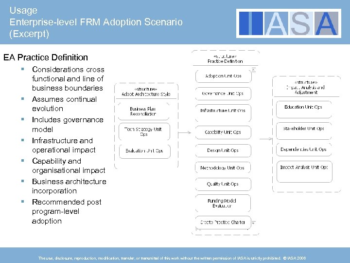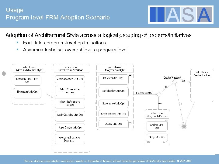 Usage Enterprise-level FRM Adoption Scenario (Excerpt) EA Practice Definition § Considerations cross functional and line of business boundaries § Assumes continual evolution § Includes governance model § Infrastructure and operational impact § Capability and organisational impact § Business architecture incorporation § Recommended post program-level adoption The use, disclosure, reproduction, modification, transfer, or transmittal of this work without the written permission of IASA is strictly prohibited. © IASA 2006