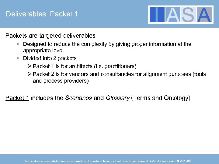 Deliverables: Packet 1 Packets are targeted deliverables § Designed to reduce the complexity by giving proper information at the appropriate level § Divided into 2 packets Ø Packet 1 is for architects (i. e. practitioners) Ø Packet 2 is for vendors and consultancies for alignment purposes (tools and process providers) Packet 1 includes the Scenarios and Glossary (Terms and Ontology) The use, disclosure, reproduction, modification, transfer, or transmittal of this work without the written permission of IASA is strictly prohibited. © IASA 2006