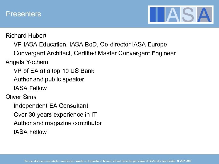 Presenters Richard Hubert VP IASA Education, IASA Bo. D, Co-director IASA Europe Convergent Architect, Certified Master Convergent Engineer Angela Yochem VP of EA at a top 10 US Bank Author and public speaker IASA Fellow Oliver Sims Independent EA Consultant Over 30 years experience in IT Author and magazine contributor IASA Fellow The use, disclosure, reproduction, modification, transfer, or transmittal of this work without the written permission of IASA is strictly prohibited. © IASA 2006