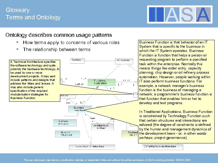 Glossary Terms and Ontology describes common usage patterns § How terms apply to concerns of various roles § The relationship between terms A Technical Architecture specifies the software technology and quite possibly the hardware technology, to be used by one or more development projects. It may well include patterns and designs that address the 'ilities and 'iences. It may also include generic specification of the required modularisation strategies for Business Function is that behavior of an IT System that is specific to the business in which the IT System operates. Business Function is function that helps a person or requesting program to perform a specified task within the enterprise. Normally this means things like order entry, capacity planning, chip design or oil refinery process automation. However, people working within IT also perform business functions. For example, a network manager's business function is the business of managing a network; a programmer's business function is that function that enables him or her to develop and test programs. In Traditional Applications, Business Function is constrained by Technology Function such that certain structures and interactions are advised (the degree of constraints is defined by the human and management dynamics of the development team - or, in other words perhaps, project governance). The use, disclosure, reproduction, modification, transfer, or transmittal of this work without the written permission of IASA is strictly prohibited. © IASA 2006